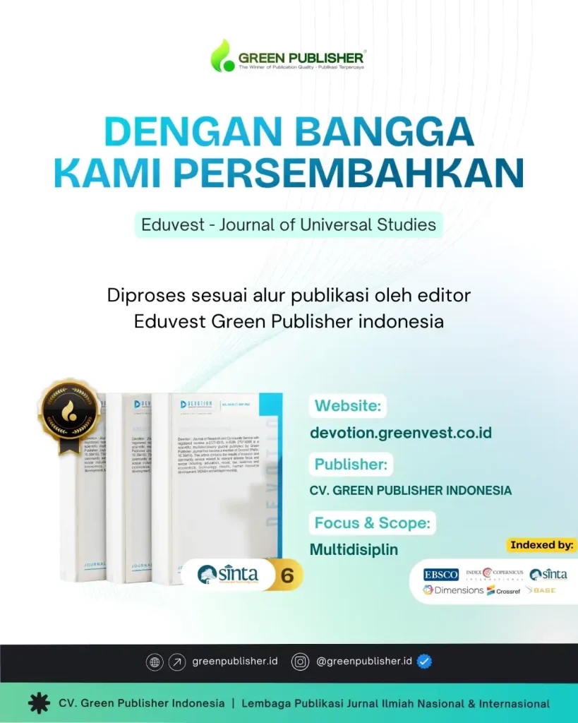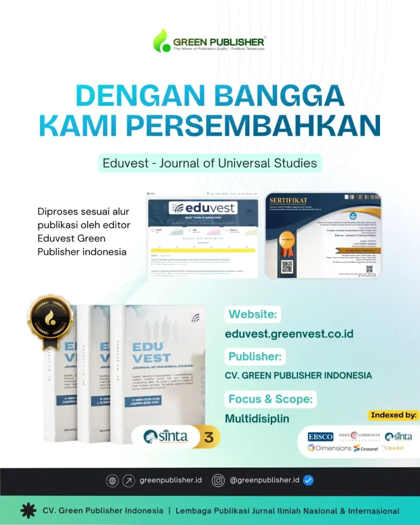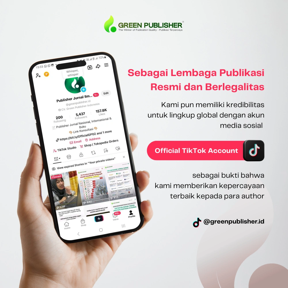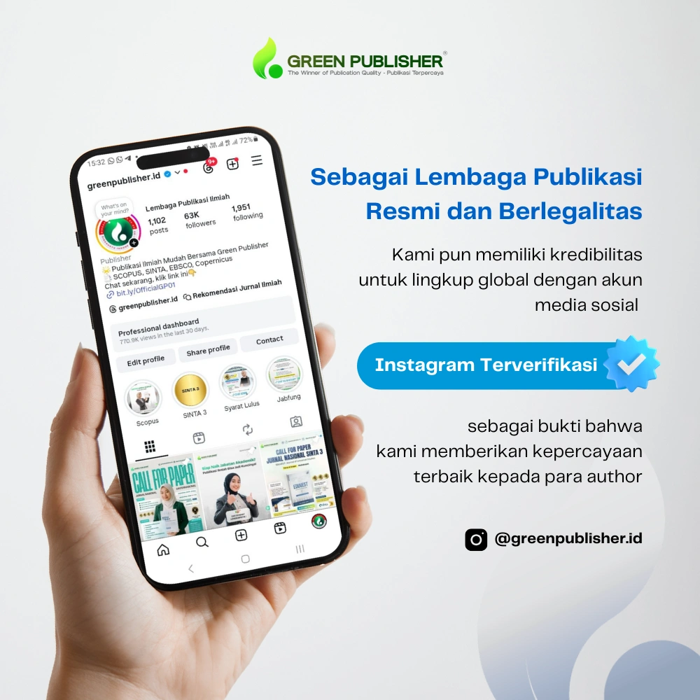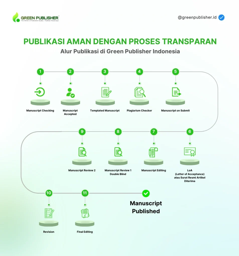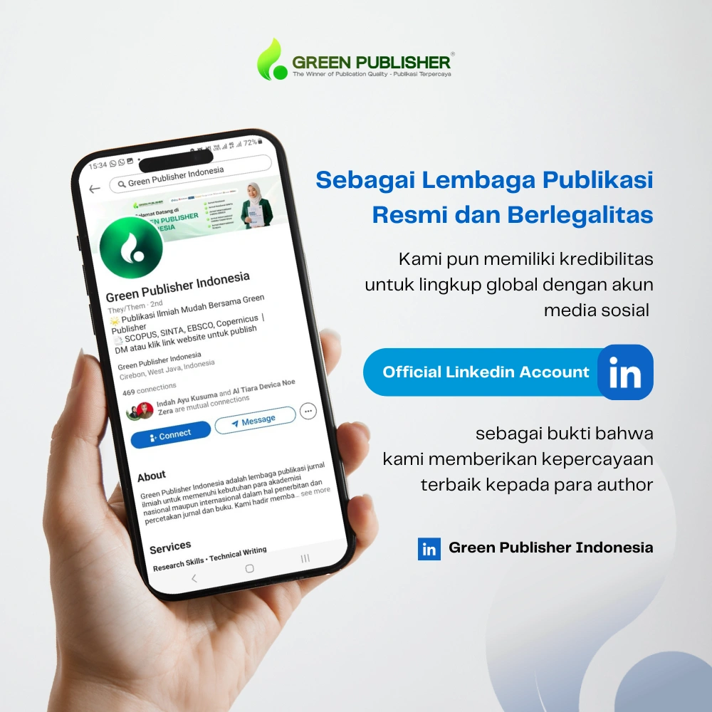 GREEN PUBLISHER adalah Lembaga Publikasi Ilmiah yang sudah berdiri sejak 2018 dan resmi berbadan hukum dengan Nomor Induk Berusaha (NIB): 0304220013798 dan Resmi berbadan hukum serta sudah berbentuk CV. Sejak didirikan, GREEN PUBLISHER telah membantu ribuan akademisi dalam menerbitkan jurnal dan buku, baik yang terakreditasi nasional maupun bereputasi internasional.